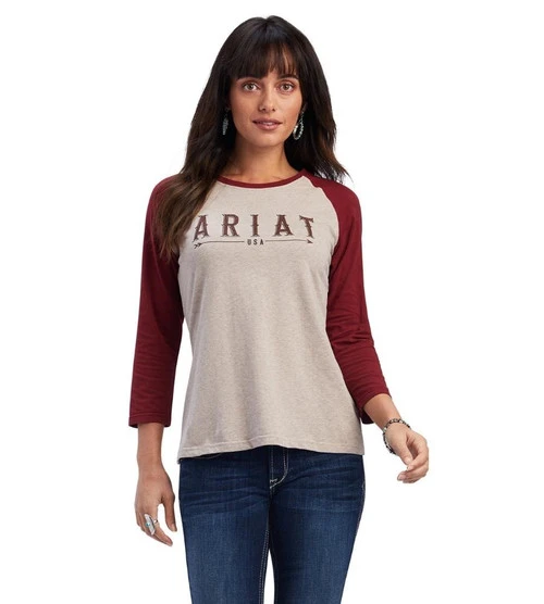 Ariat REAL Arrow Raglan Tee in soft cotton jersey knit has the Ariat USA logo underlined with an arrow. Extra comfortable with low key Southwestern style, the casual baseball shirt style has practical 3/4 length sleeves and a classic fit.