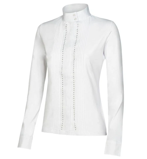 The Equiline Gerda G Show Shirt has a beautiful, elegant look with sophisticated pleats and sparkling rhinestone trim down the full length front placket. Coordinating jewel buttons at the wrap collar and cuffs. Women’s long sleeve equestrian show shirt has a full button front placket with rhinestone accents. This elegant horse show shirt can easily be worn in the jumper arena as well as for dressage.