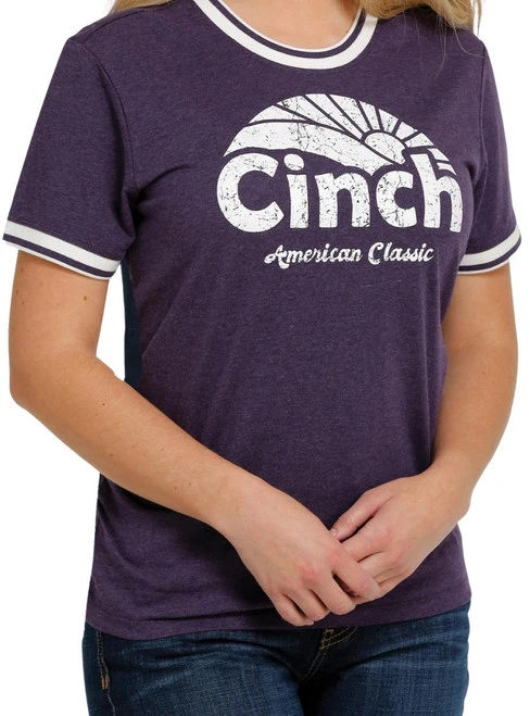 Cinch Logo Tee for ladies is a cute retro ringer style with striped trim at the rounded neck and short sleeves. A weathered graphic of the sun behind mountains has Cinch print and American Classic script underneath. What is not to love about that heathered grape color?!